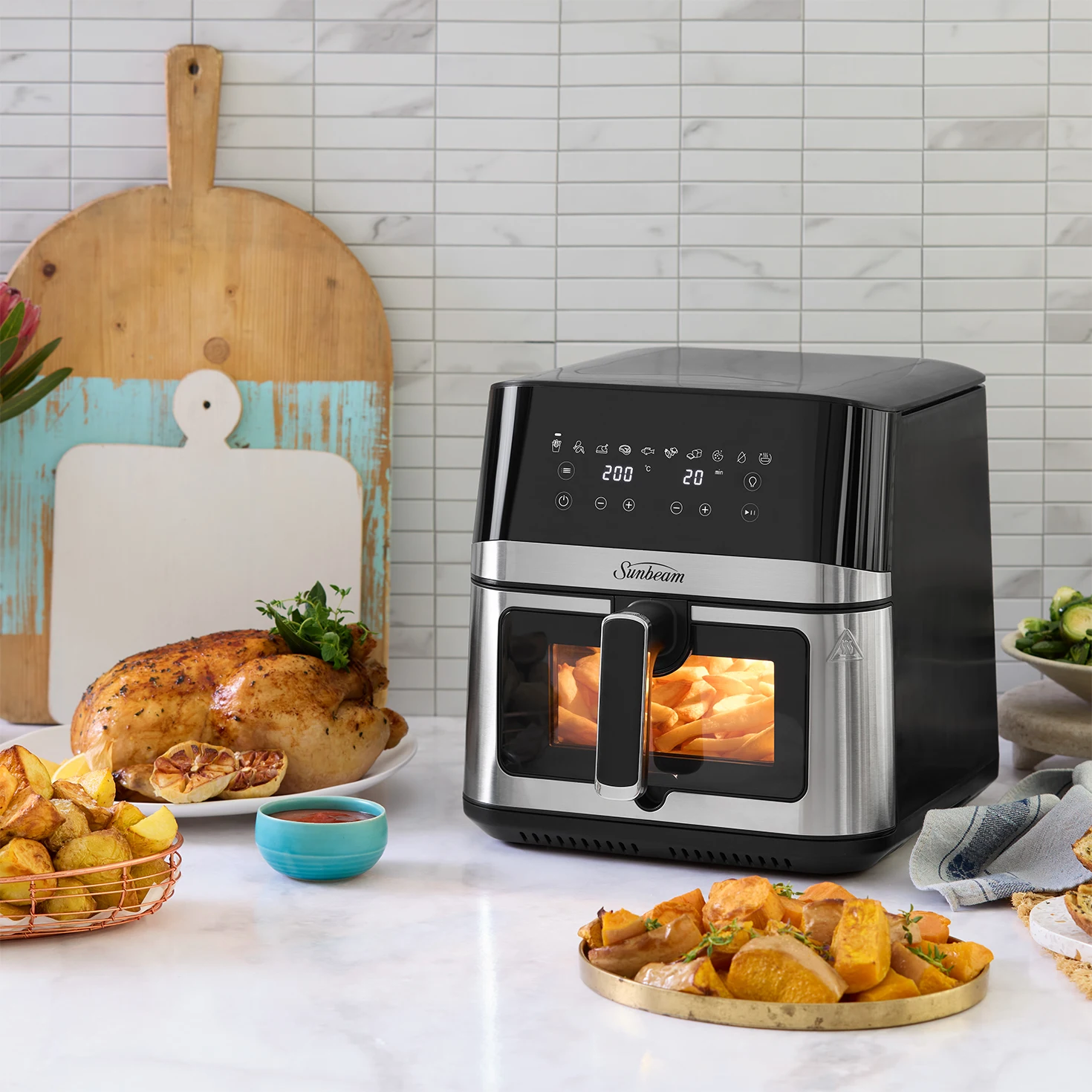 Select from Fries, Chicken Wings, Poultry, Pork, Fish, Vegetables, Bake, Dessert, Dehydrate and Reheat.